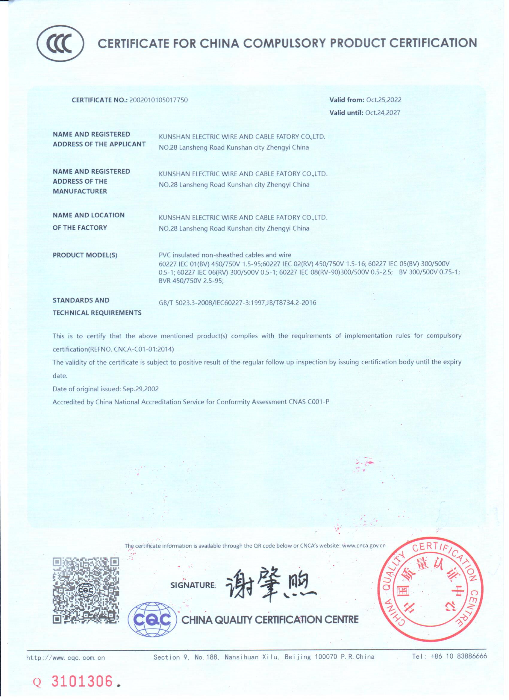 中國國家強制性產(chǎn)品認證證書 2002010105017750 英文版